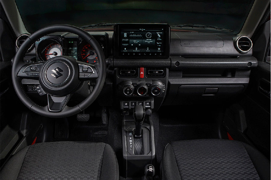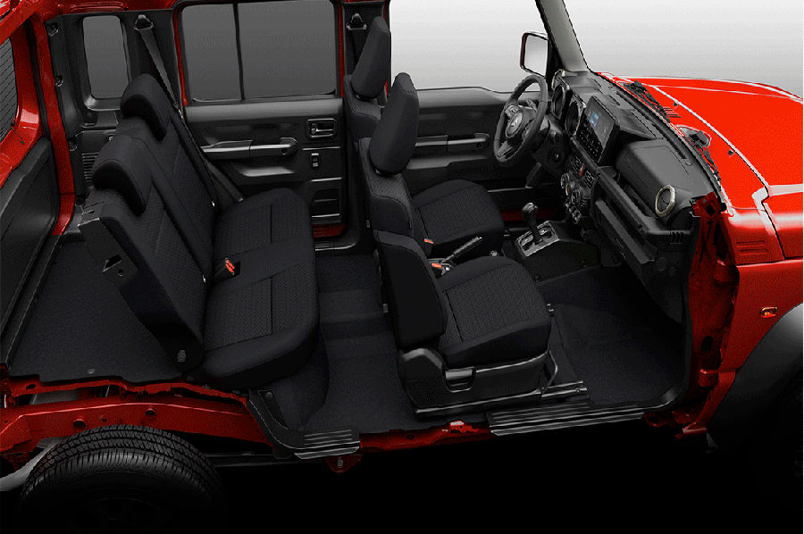 The New Jimny 5-door offers monotone color options for the GL and GLX variants, including Jungle Green, Celestial Blue Pearl Metallic, Arctic White Pearl, and Granite Gray Metallic. The GLX Two-Tone variant, on the other hand, is available in Sizzling Red Metallic – Bluish Black Pearl and Chiffon Ivory Metallic – Bluish Black Pearl.